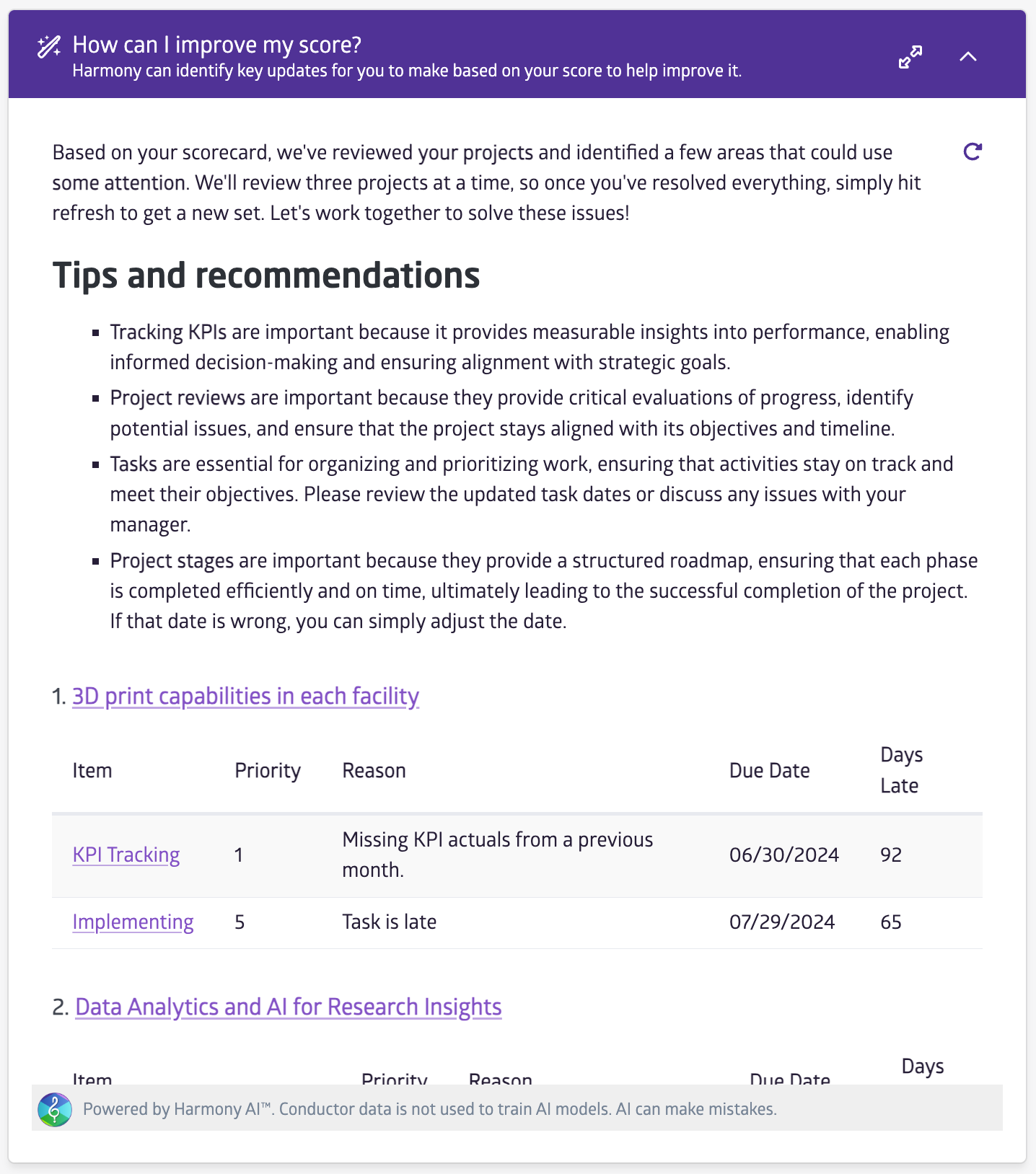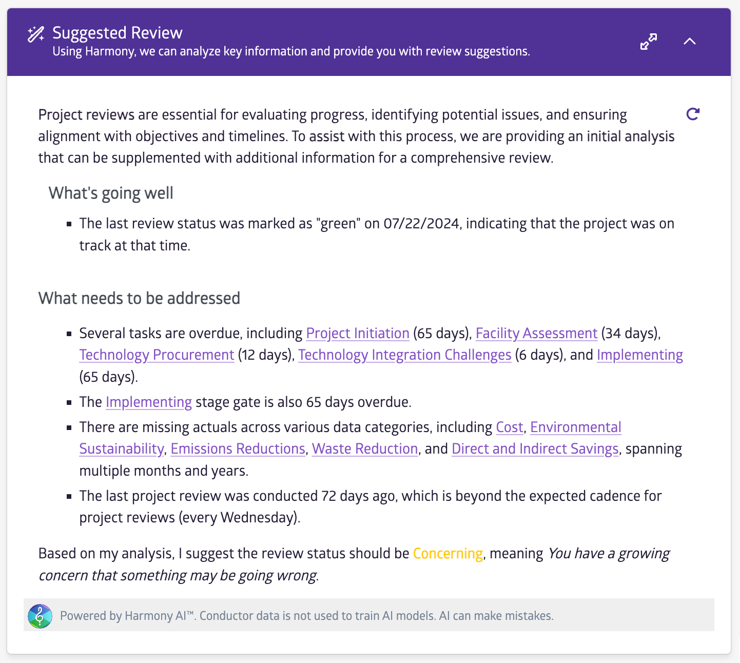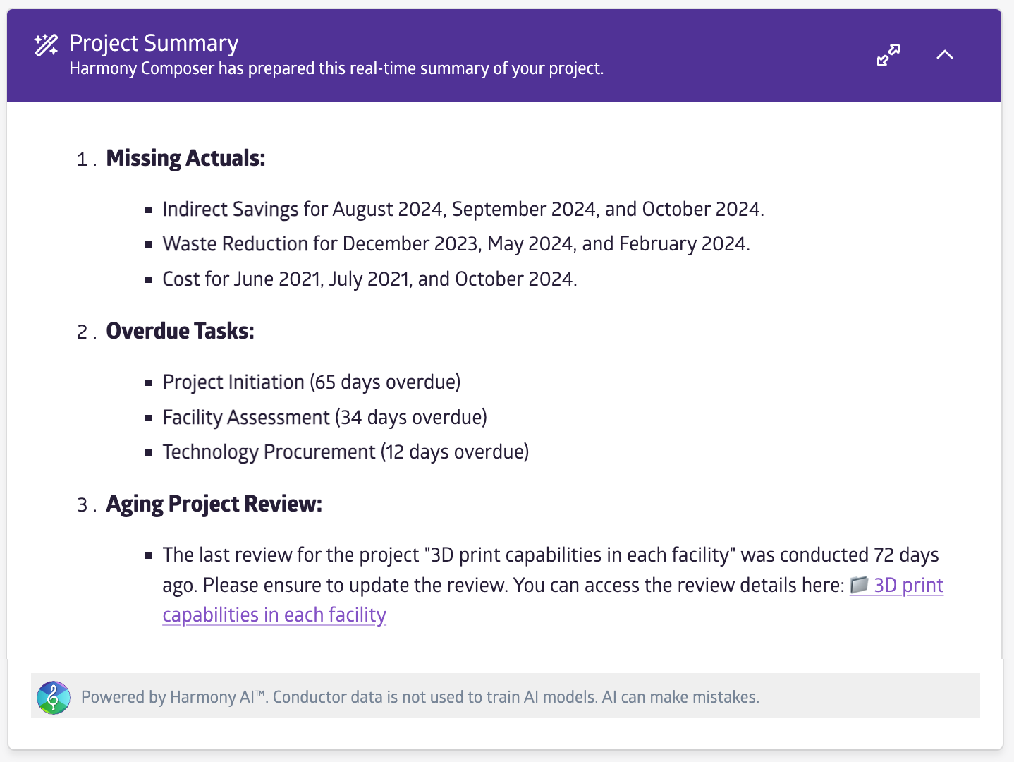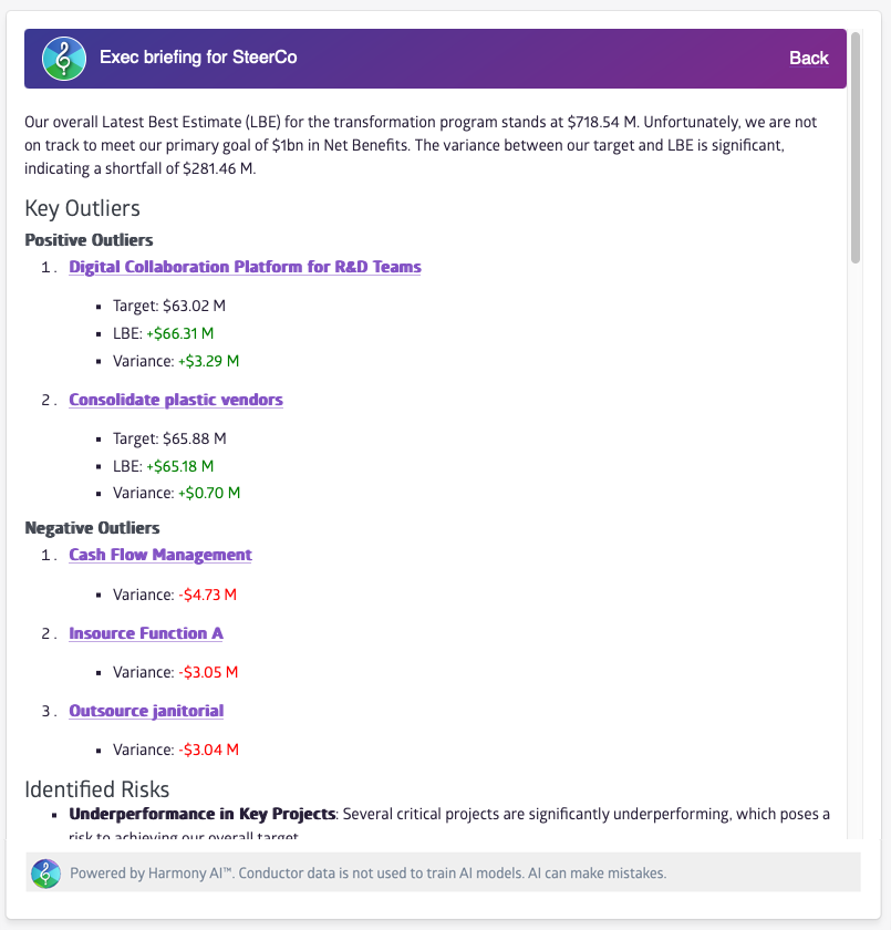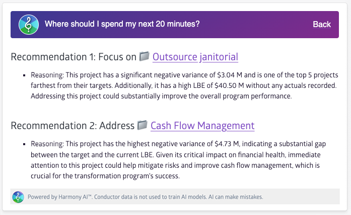 Harmony AI tailors insights to individual roles, helping teams make informed decisions. With deep data integration and privacy measures, it provides real-time, focused insights across enterprise programs, ensuring efficient oversight and proactive issue management.