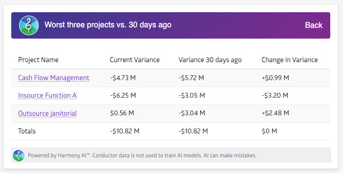 Complex, enterprise-grade programs are virtually impossible for humans to properly manage. The very nature of their size and scope means you can't possibly have your eyes on every project your team is executing. Let Harmony watch your blind spots with intelligent, highly focused Insights analysis across your biggest concerns.